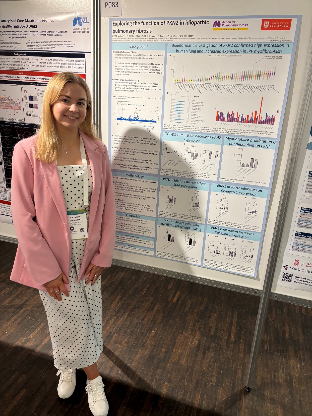 APF Mike Bray Fellow, Dr Richard Allen, identified that a genetic variant (a small change to a person’s DNA) is more commonly found in the PKN2 gene of people with IPF compared to those without IPF. Catherine took this finding forward to explore what role the PKN2 gene plays in driving lung scarring. Catherine used different types of lung cells, grown in the lab, to measure the effect of switching the PKN2 gene on and off in these cells. Catherine’s findings presented at the European Extracellular Matrix Pharmacology Congress, indicate for the first time that PKN2 may be involved in protecting the lungs from scarring. Further work is required to better understand what role altered PKN2 plays in pulmonary fibrosis, to aid in the identification of new or existing medicines that can slow lung scarring.
