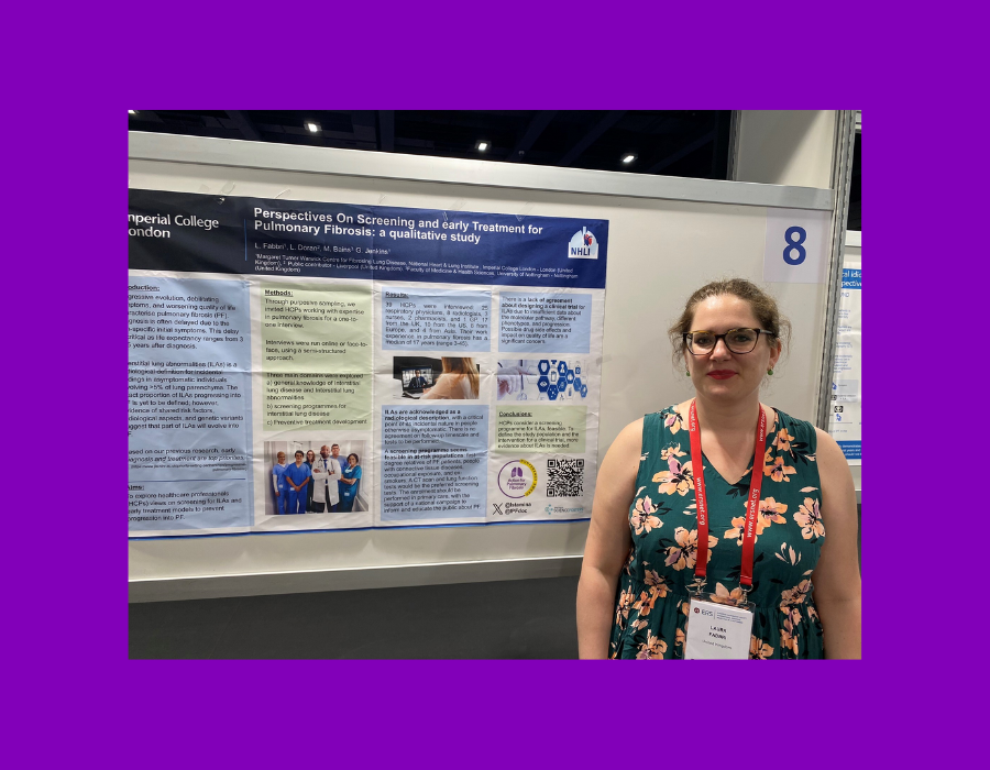 Laura has recently focused on looking at the different healthcare professionals perspectives for screening and early treatment for pulmonary fibrosis (POSTPF study). Laura interviewed 39 different healthcare professionals to understand what they thought about interstitial lung abnormalities (ILAs). These are incidental findings can be seen on some scans. Some people with ILAs later develop pulmonary fibrosis; however, not all patients do. Laura has explored what healthcare professionals think the best course of action would be and if healthcare professionals think that people with ILAs should receive treatment.